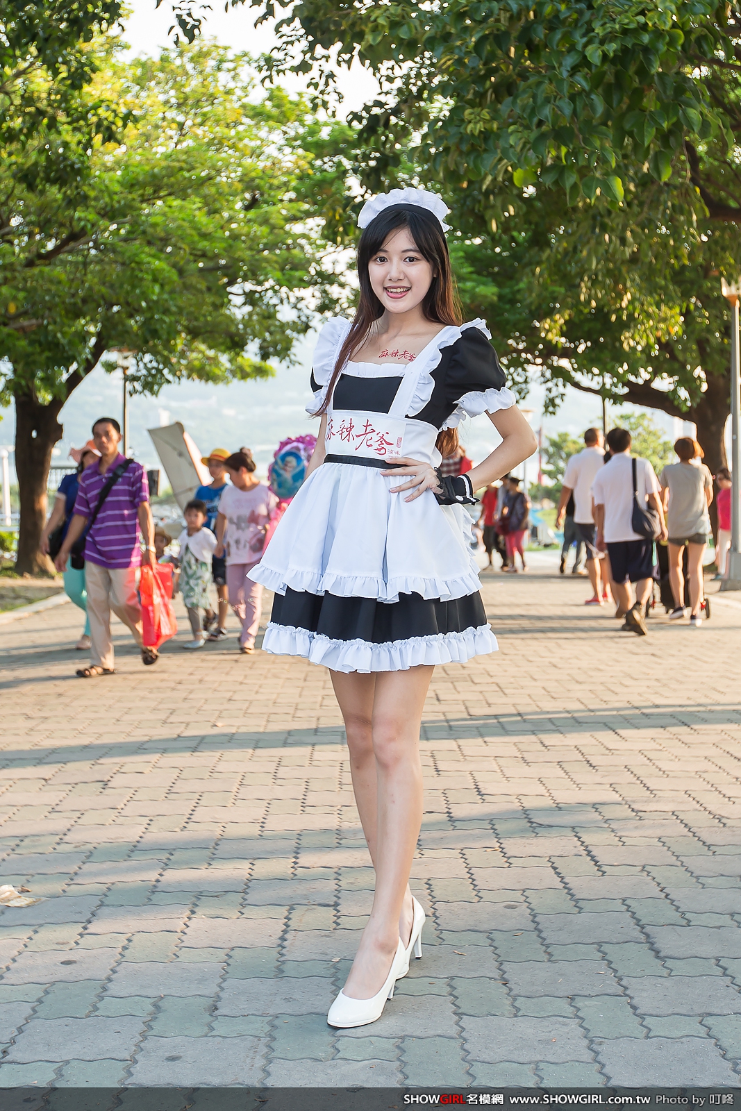 相當到位的女僕裝造型,由髮帶、小圍巾、腕套和一件式裙裝組成。黑白對比的用色,很有漫畫中女僕的特質。
